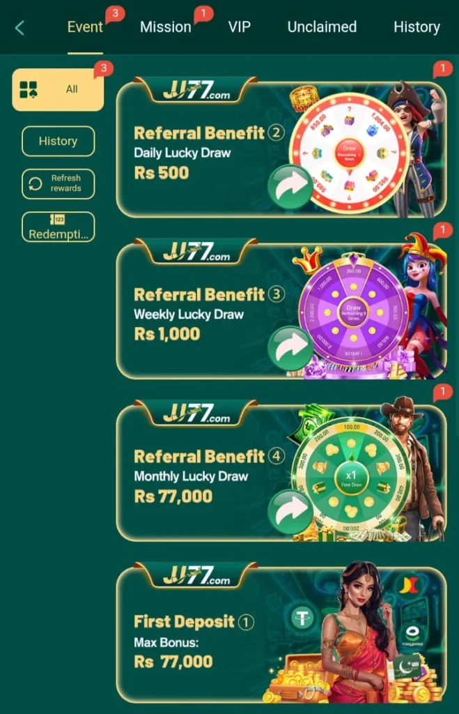 Certain variants of JJ77 Game have a referral program incorporated in them. The user can refer their friends, earning them a few rewards when they download and begin using it.